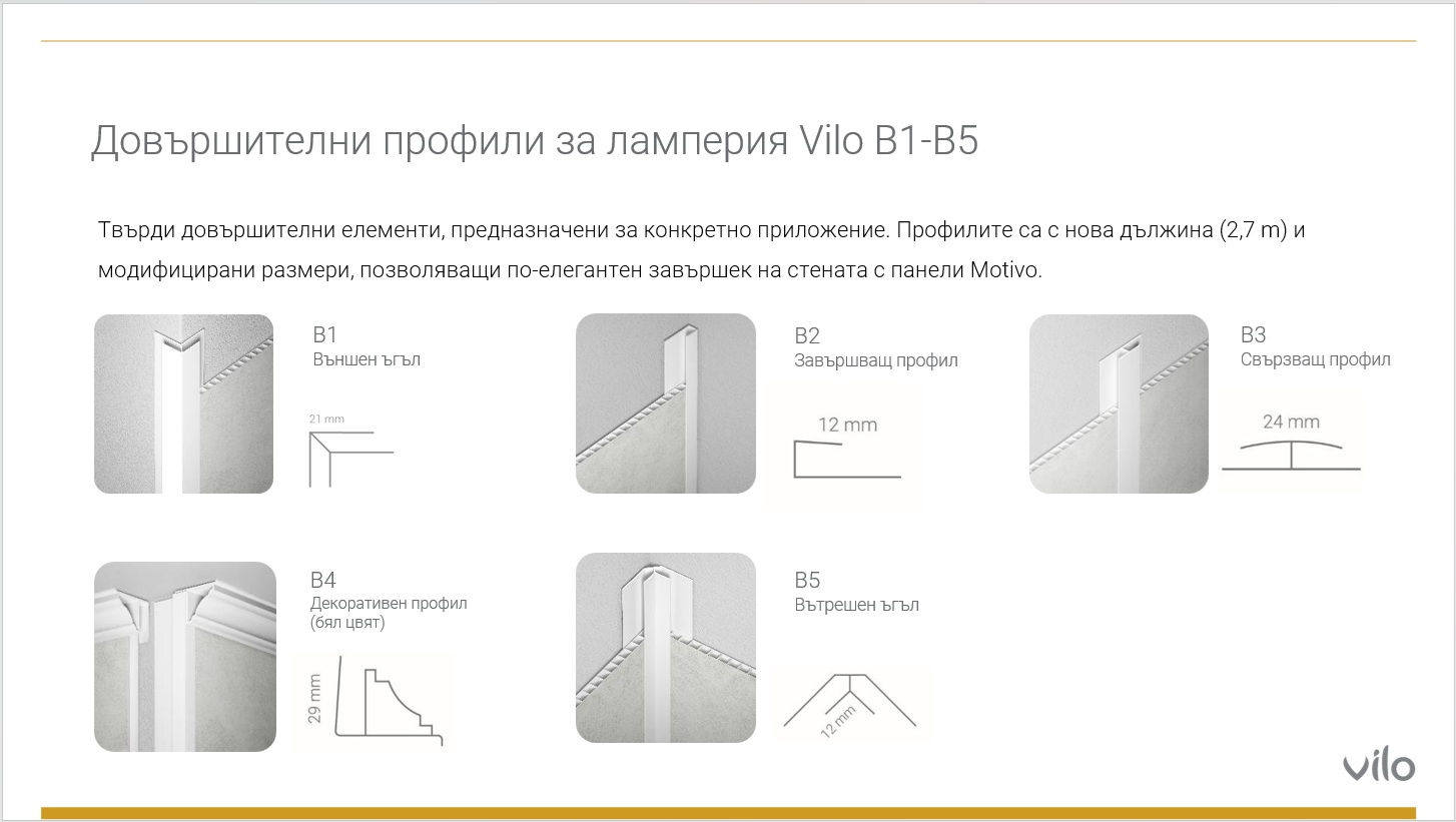 Vilo е марка, специализирана в производството на довършителни материали за дома, които съчетават добър дизайн и достъпна цена. Офертата на Vilo включва декоративни стени, подови подложки, подови первази, ламперия и вътрешни подпрозоречни первази.