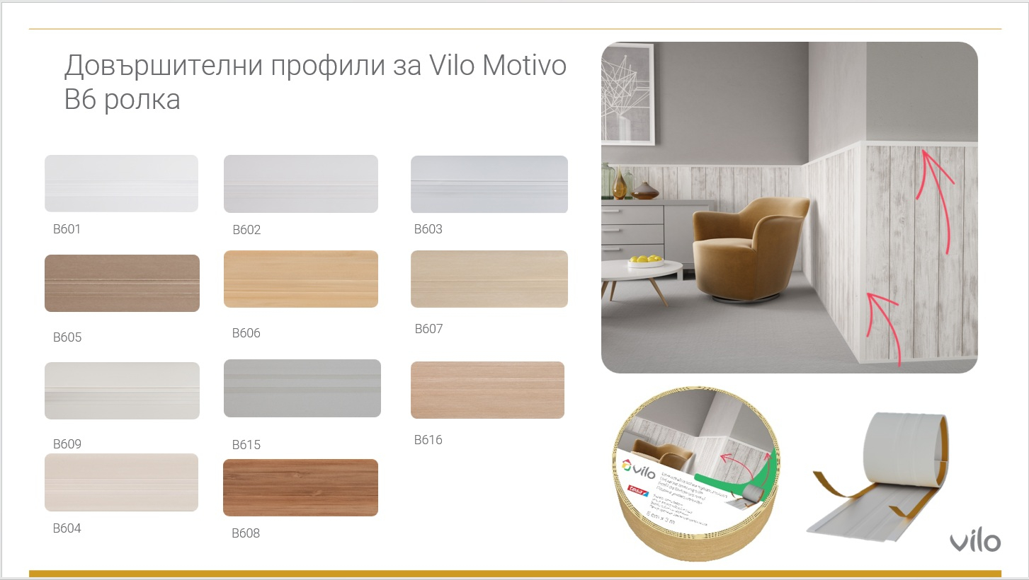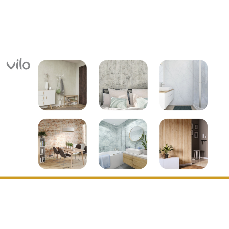 Vilo е марка, специализирана в производството на довършителни материали за дома, които съчетават добър дизайн и достъпна цена. Офертата на Vilo включва декоративни стени, подови подложки, подови первази, ламперия и вътрешни подпрозоречни первази.