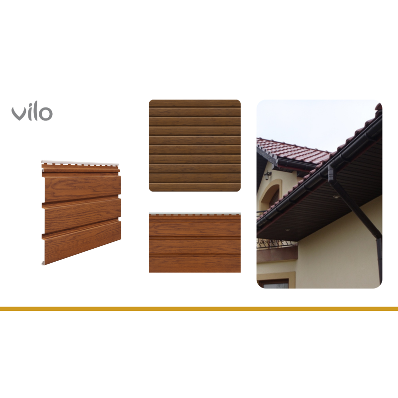 Софит SVP 08 възпроизвежда дървесна текстура и цвят, запазва цвета си с години и не се разслоява или лющи. Благодарение на самопочистващата си структура намалява натрупването на мръсотия.