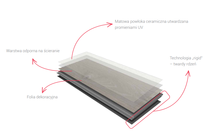 - Висока устойчивост на надраскване и петна - твърдата сърцевина и UV-втвърденото керамично матово покритие осигуряват изключителна устойчивост на механични повреди, което прави пода идеален за зони с голям трафик.