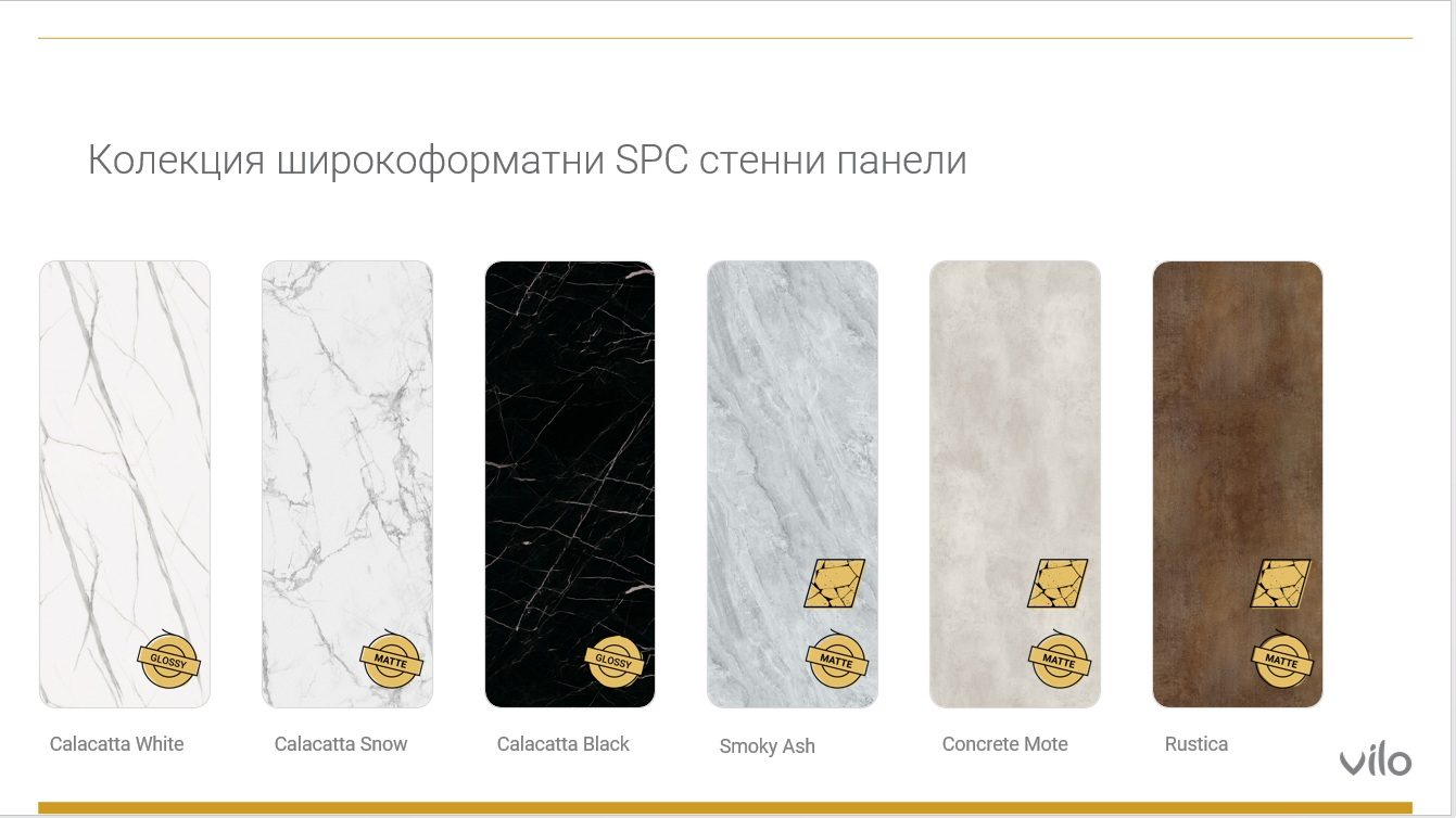 - Изключителен дизайн – SPC панелите се предлагат във формат 30х60см, 60х120см. а вече налични и в визуално съвършения широкоформатен размер 120х265см, с гланциран ефект или релефна матирана структура.