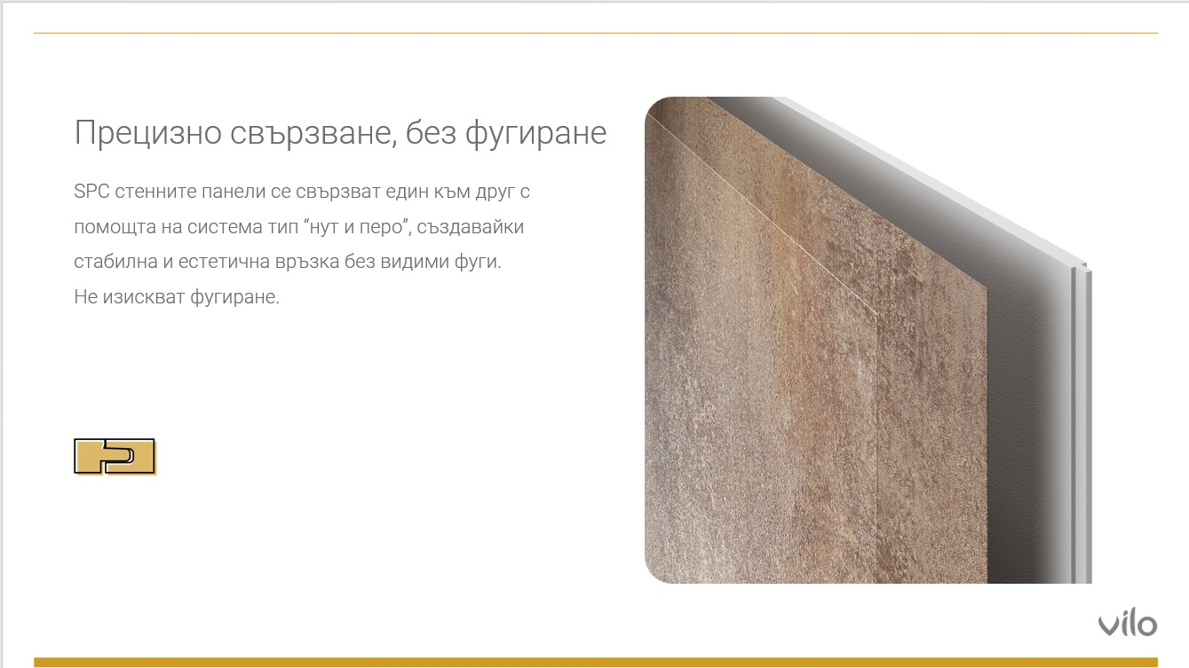 - Без фугиране - SPC панелите Vilo не изискват фугиране – по този начин се избягва оформянето на зони, потенциално изложени на мухъл и плесен.