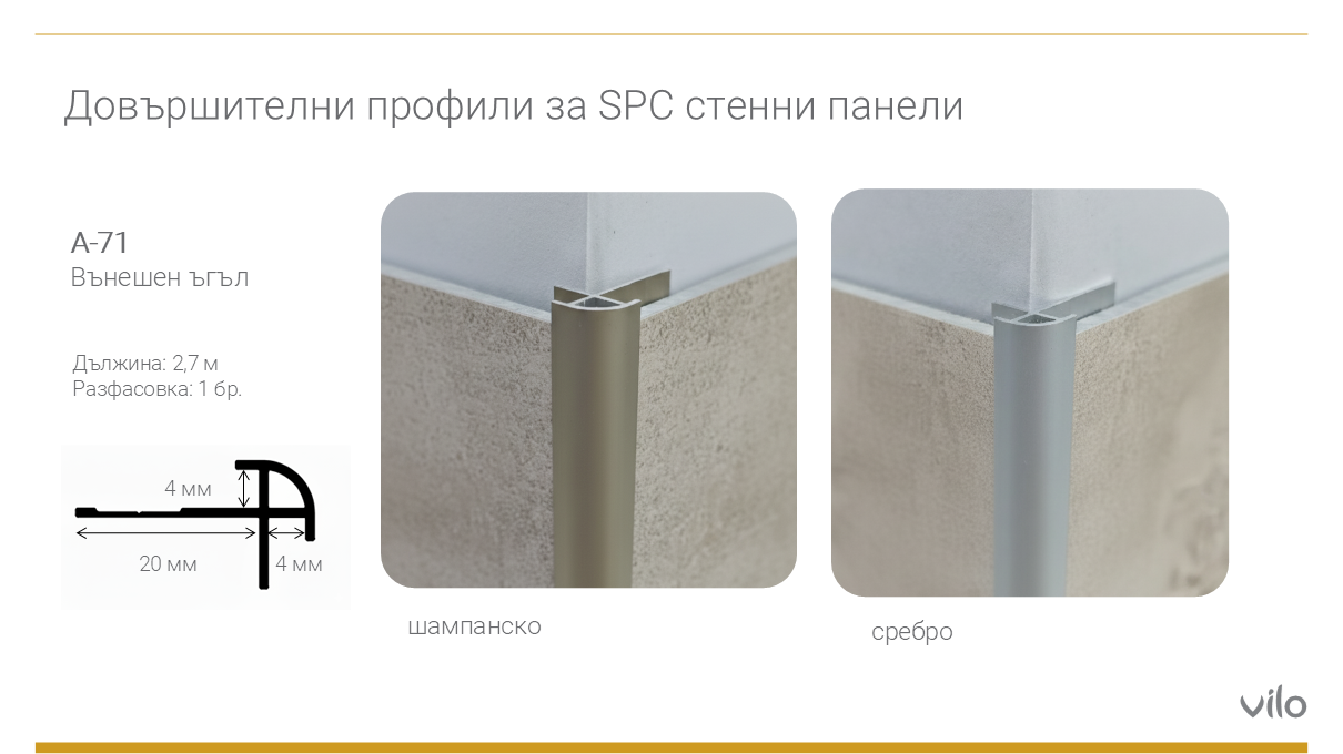 Vilo е марка, специализирана в производството на довършителни материали за дома, които съчетават добър дизайн и достъпна цена. Офертата на Vilo включва декоративни стени, подови подложки, подови первази, ламперия и вътрешни подпрозоречни первази.