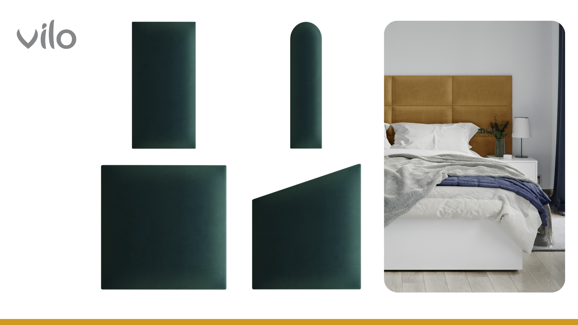 Forma dreptunghiulară a panourilor este extrem de versatilă, permițând crearea de tăblii de pat elegante sau pereți de accent care pot extinde vizual încăperea. Deși panourile tapițate Vilo sunt disponibile într-o varietate de forme (pătrate, ovale, trapez), designul dreptunghiular este perfect pentru a obține un aspect simetric și ordonat.