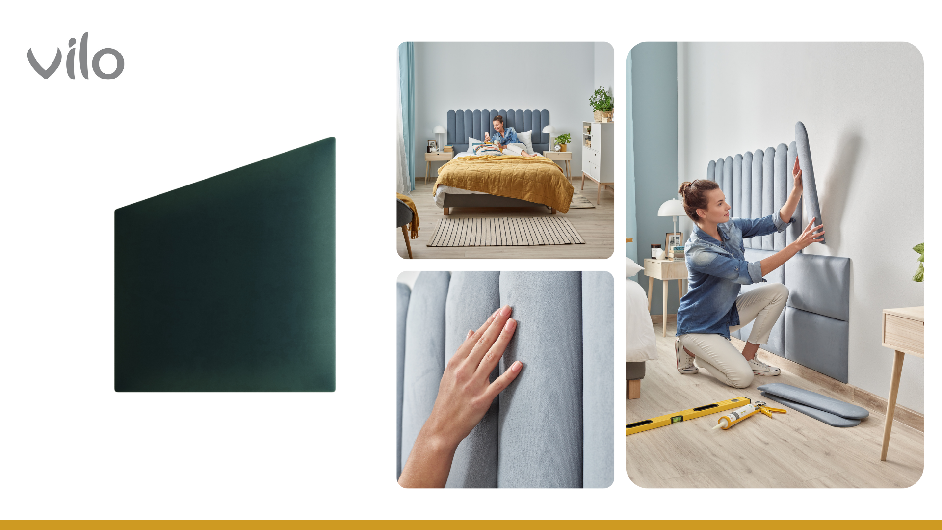 Forma de trapez deschide o multitudine de posibilități de design. Poți crea aranjamente geometrice dinamice, ziduri de accent cu efect 3D sau tăblii de pat care atrag privirea. Panourile tapițate Vilo, disponibile în diverse forme (precum pătrate, ovale, dreptunghiuri și trapez), îți permit să combini culori și forme pentru a obține un decor unic.