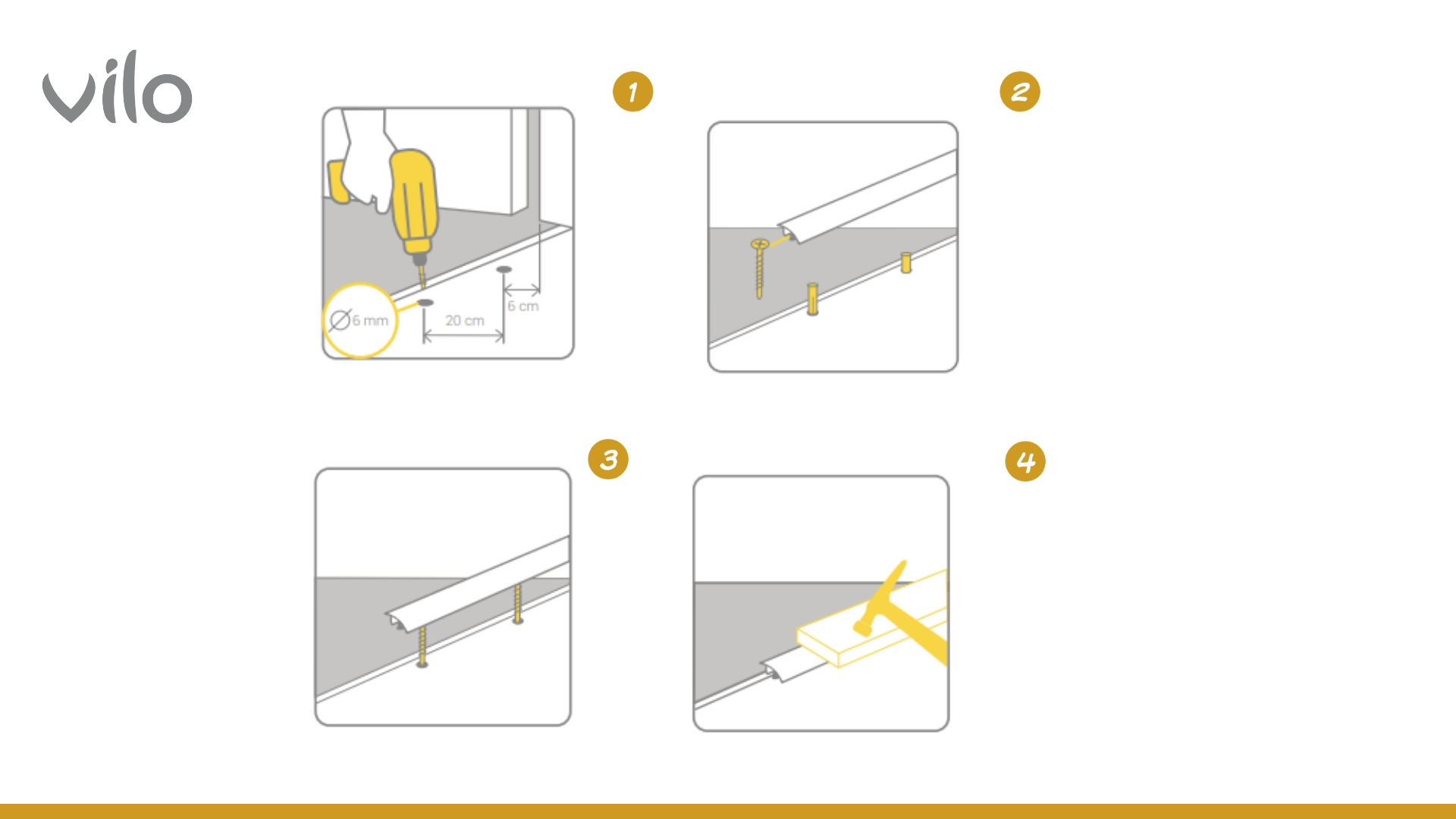Так, продукти Vilo розроблені для простого монтажу, що дозволяє легко встановити їх самостійно без потреби у спеціалізованих інструментах. Достатньо базового набору інструментів і, за бажанням, спеціальних монтажних клеїв Vilo, які додатково полегшують закріплення продуктів. Інструкції з монтажу інтуїтивно зрозумілі та адаптовані навіть для людей без досвіду в оздоблювальних роботах, що дозволяє швидко оновити інтер'єр.